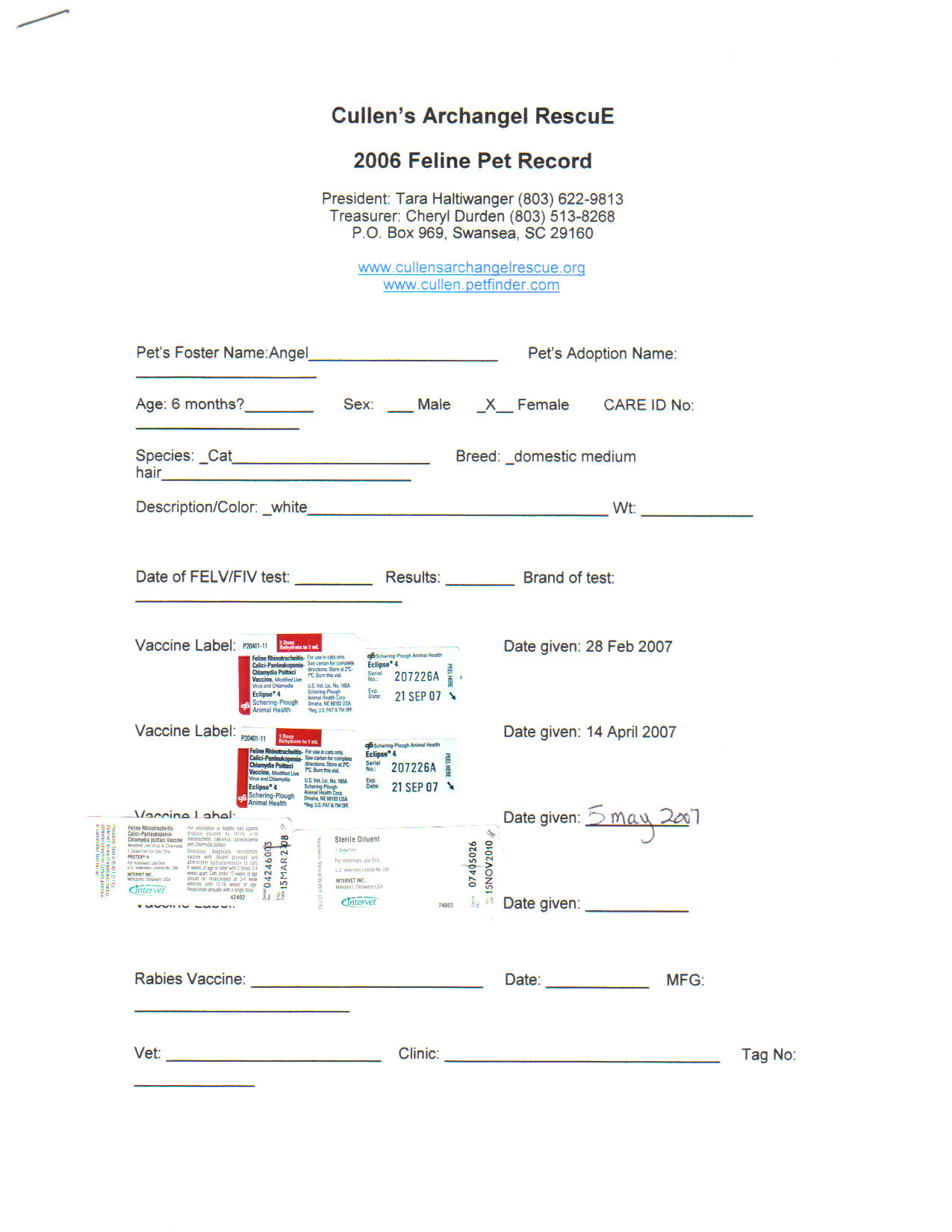 Angel came into our rescue from a volunteer in Augusta, GA. She was found wondering around a gas station, filthy, hungry and lonely. She was transported to an open foster spot in Sumter, SC. Angel is a real sweetie pie! Angel has been treated for fleas, dewormed, vaccinated, tested for FELV/FIV (negative), and spayed. This beautiful girl is now ready for a forever family of her own. If interested, please email us an application or call. More about AngelGood with Dogs, Good with Cats, Good with Kids Adoption saves lives! Other Pictures of Angel (click to see larger version):